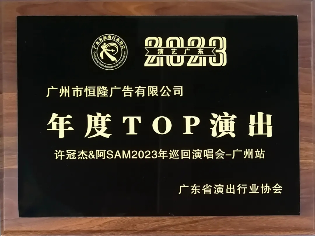 恒隆娛樂申報的“許冠杰&阿SAM2023年巡回演唱會-廣州站” 榮獲 廣東演藝2023“年度TOP演出(演唱會)”